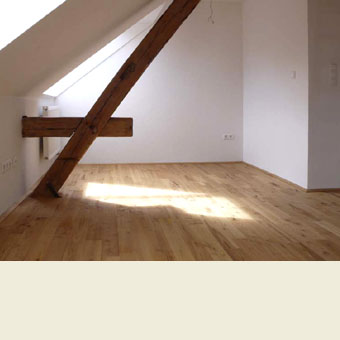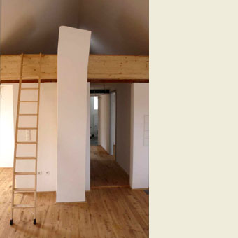 Mit einigen wenigen Änderungen der bestehenden Grundrissdisposition unter Beibehaltung des Tragwerkes konnte eine großzügige helle Dachgeschosswohnung entstehen. Ein Augenmerk lag dabei auf der maximalen Ausnutzung des Dachstuhles als Wohnfläche bis unter den First. Dadurch entstanden Bereiche, die Loft-Charakter besitzen. Über Teilen der Mit einer Zwischenebene über einem Teil der Wohnung wurde ein zusätzlicher Schlaf- oder Rückzugsbereich geschaffen.